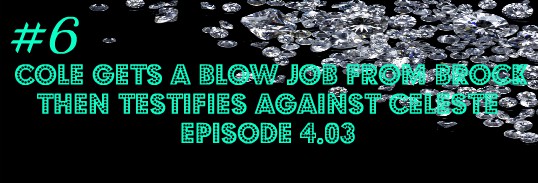 The reason this gets on my top 10 list is because it was a pretty big moment for these two as a couple. They met in episode one and had a classic soapy encounter where they didn't exactly get off on the right track, but the attraction was there. They continued to have run-ins and the chemistry grew. Of course, this is a soap, so she was engaged to Cole's father, Mac. They realized this at the engagement party and vowed to stay away from one another. After Celeste married Mac, he went away for business leaving her alone with Cole. A rain storm hit and they had sex. It was a moment that had been coming since episode one and I don't think it let any C&C fans down. It is still up there as one of the moments that defined the first season and them as a couple.